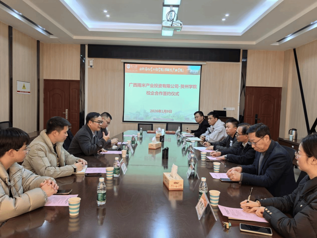 1月9日,贺州学院与广西雨米产业投资有限公司在求真楼220会议室举行了产学研框架协议签约仪式。广西雨米产业投资有限公司总裁李鸣、副总裁李启生,贺州学院科研处处长严小威、材料与化学工程学院书记莫达隆等双方代表出席。会议由材料与化学工程学院副院长李鹏博士主持。