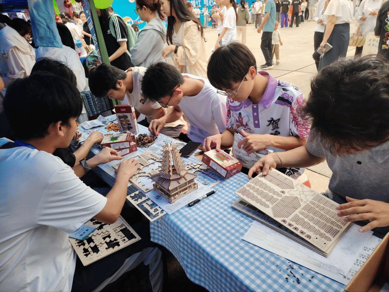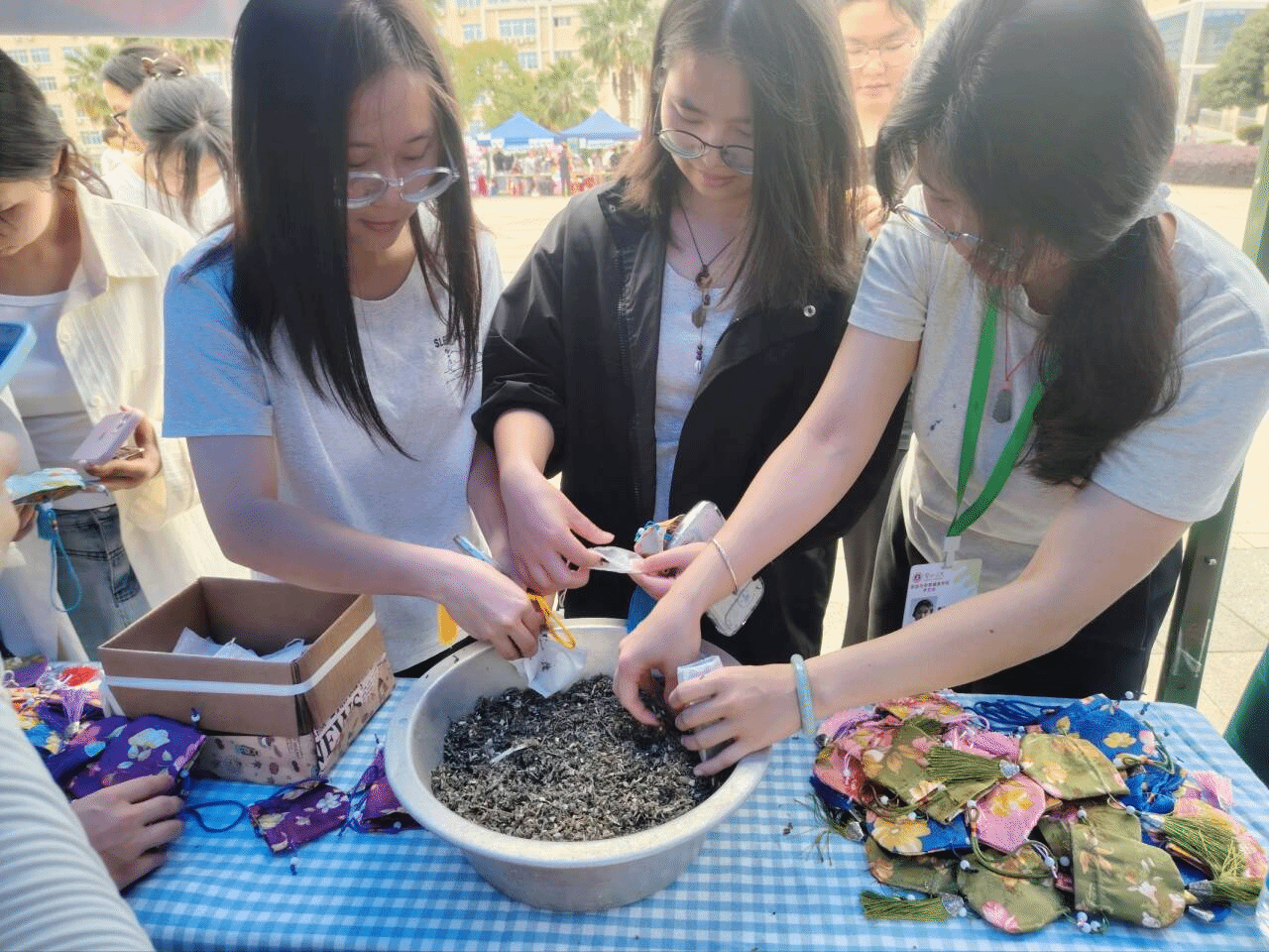 活动现场气氛热烈,工作人员耐心指导,师生们分工协作,有序进行各项体验。大家亲手拼装鼓楼模型,不仅感受到了侗族建筑的精妙智慧,还增进了对传统文化的理解和认同;同时,通过装填艾草、桂花等香料制作特色香囊,让师生们体验了传统文化乐趣,进一步加深了对三月三民俗文化的认识。